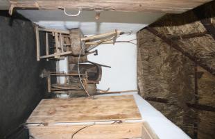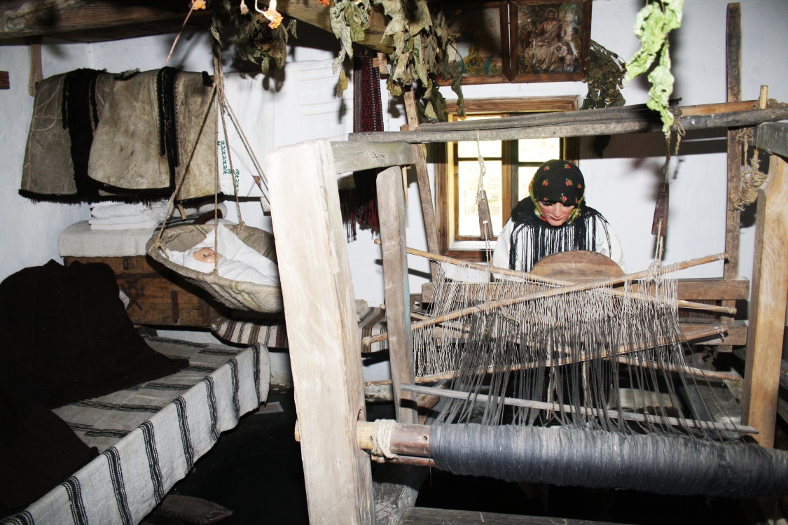 The inside of a poor man’s house – typical for this part of Bucovina. The floor is covered with clay. On the left side of the entrance, there is a stove also covered with clay and dubbed with oil. The small stove was very important to the peasant, because it was used to prepare food for the family and for the animals, for heating and preserving heat. Beyond the stove, next to the wall there is a bed used as a resting place. It is made of wooden boards, with pillars stuck in the clay floor. Above the bed there is a place to keep the clothes for the man and woman, with traditional belts and bags. The baby’s cradle was hung from the ceiling. Next to the bed, on the bench there is a chest where clothes are kept. The loom is placed in the middle of the room. This tool is used to weave fabric for the family use and also for sale. That is why, the visitor can see different weaving instruments. The icons above the window complete the interior.