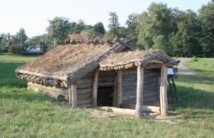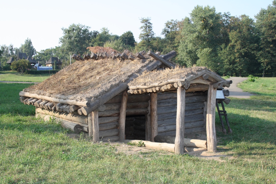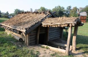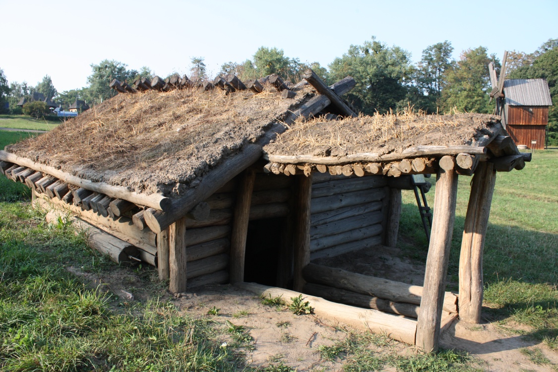 Dwelling including only one room, reconstructed based on the archaeological findings in the neighbourhood of Revne village, Kitmani rayon. This type of dwelling is specific to all the eastern Slavic tribes in this period. Rectangular construction with construction pole: the lagged walls are made of wood logs placed horizontally in longitudinal ditches dug into the pillars horizontally. The ridged roof is made of wood logs and, in order to insulate the upper part, a thick layer of clay and wattle is applied. The floor is covered with clay. The entrance into the dwelling was covered with branches glued together with soil and grass. Inside the cellar, typical furniture is replicated: clay bed, stone stove, table, benches, shelved for plates and hanger for clothes.