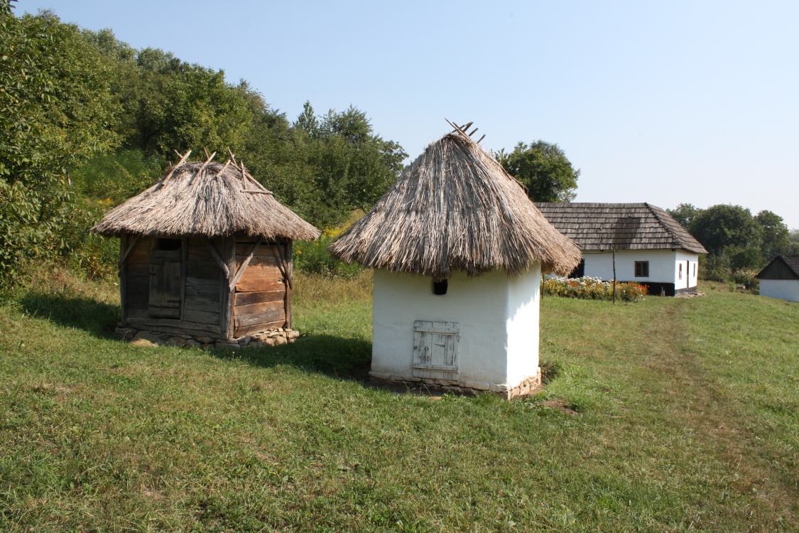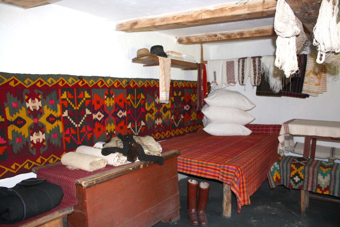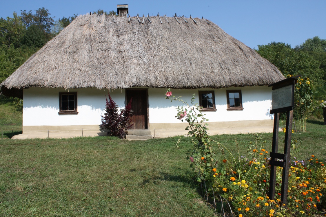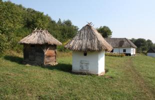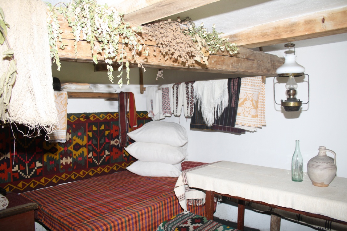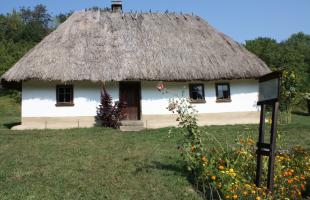 The house belonged to a peasant of average fortune. It is typical for Bucovina: wooden pillars are stuck into the ground; between the pillars, there are narrow laths braided with straws and glued with clay on both sides and blanched. The four-sided roof is covered with straw.